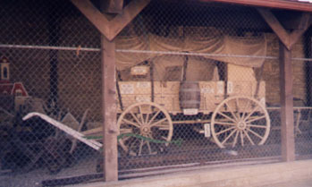 | Outside and to the rear of the building is a display containing a chuck-wagon used by one of the local ranches, and a stone burr mill, once used to grind grain into flour. The "burrs" which are two large flat stone disks, came from a quarry in Northern France famous the world over for its product. This burr-mill was used for many years on a local farm. | ![]() |