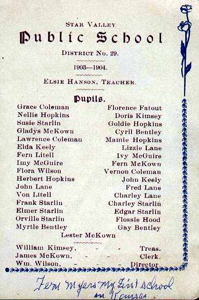 | My great grandmother was Fern Littell Myers and a few years ago I inherited some of her things. Among them was an old school souvenir card with names and photos for a Star Valley Public School District No. 29 for the year 1903-04. It says Elsie Hanson, Teacher and I'm assuming its her photo on the front cover. |