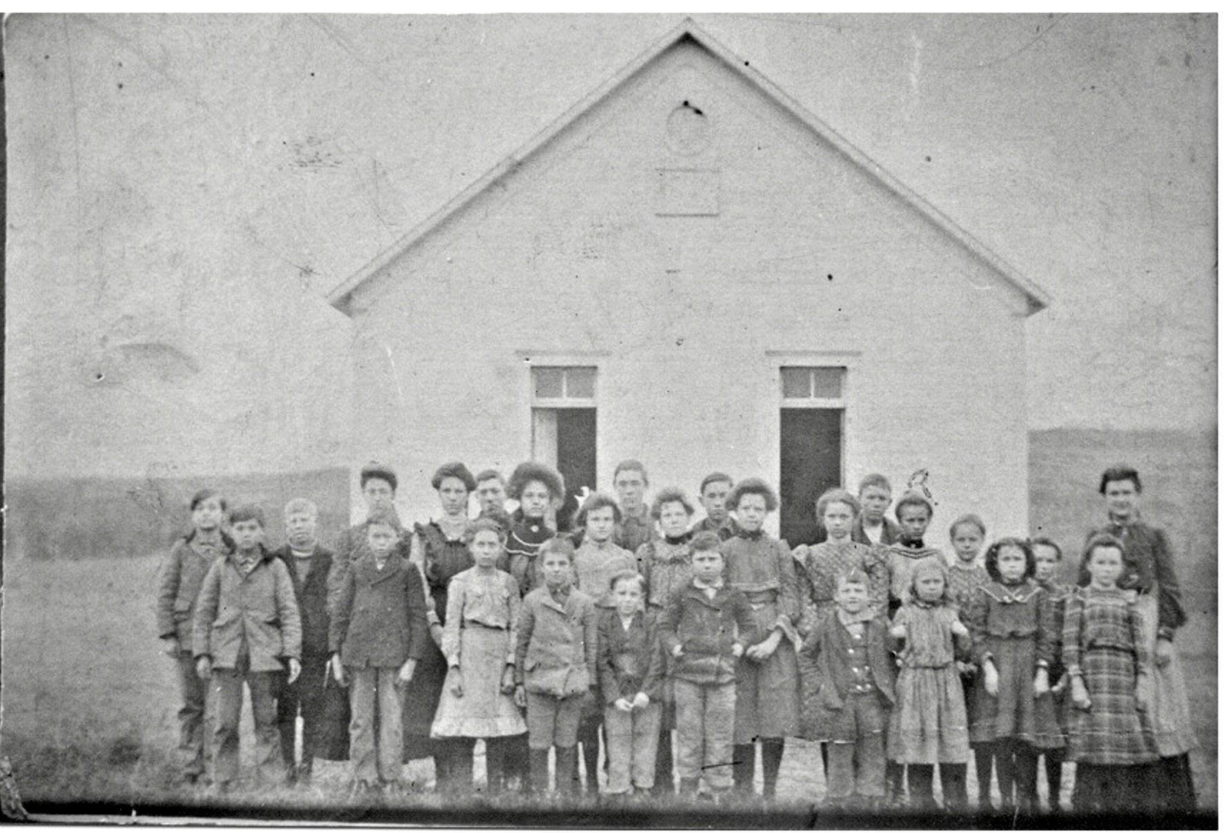 Back Row: standing from Left - Oliver Hamlin, Jake Huber, Lola Brownfield, Engra Bond, Frank Hotellling, Orpha Hamlin, Fred Schilling, Earl Terrell, Frank Hammond, Teacher - Virgia Major.