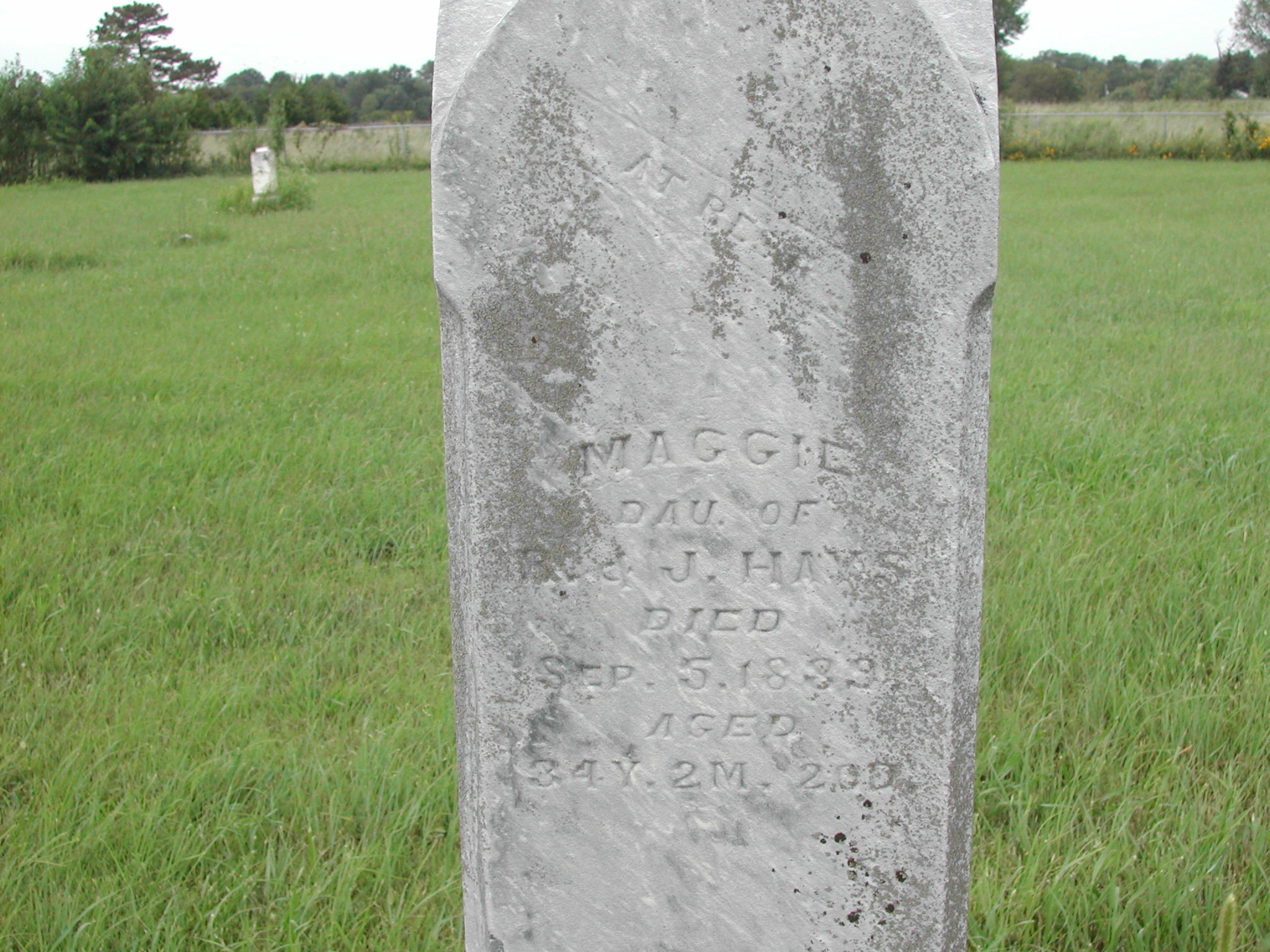 Hays, Maggie; d. 05 Sep 1889; a. 34 Yrs, 02 Mos, 20 Dys; Dau of R and J Hays; Hays monument; - Veteran status N/A;