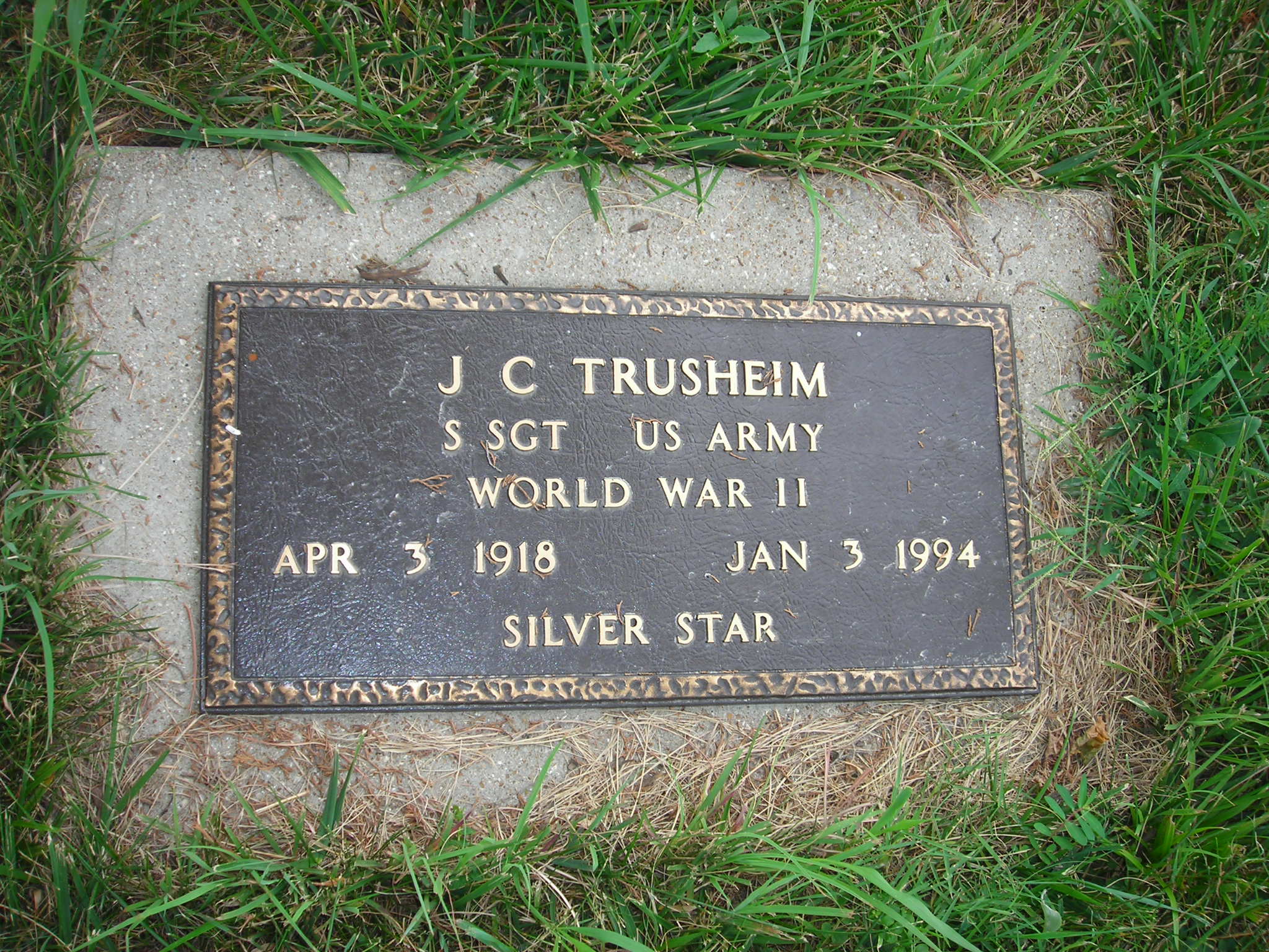 + Trusheim, J C; b. 03 Apr 1918; d. 03 Jan 1994; S SGT US Army World War II Silver Star; + Veteran; Photo