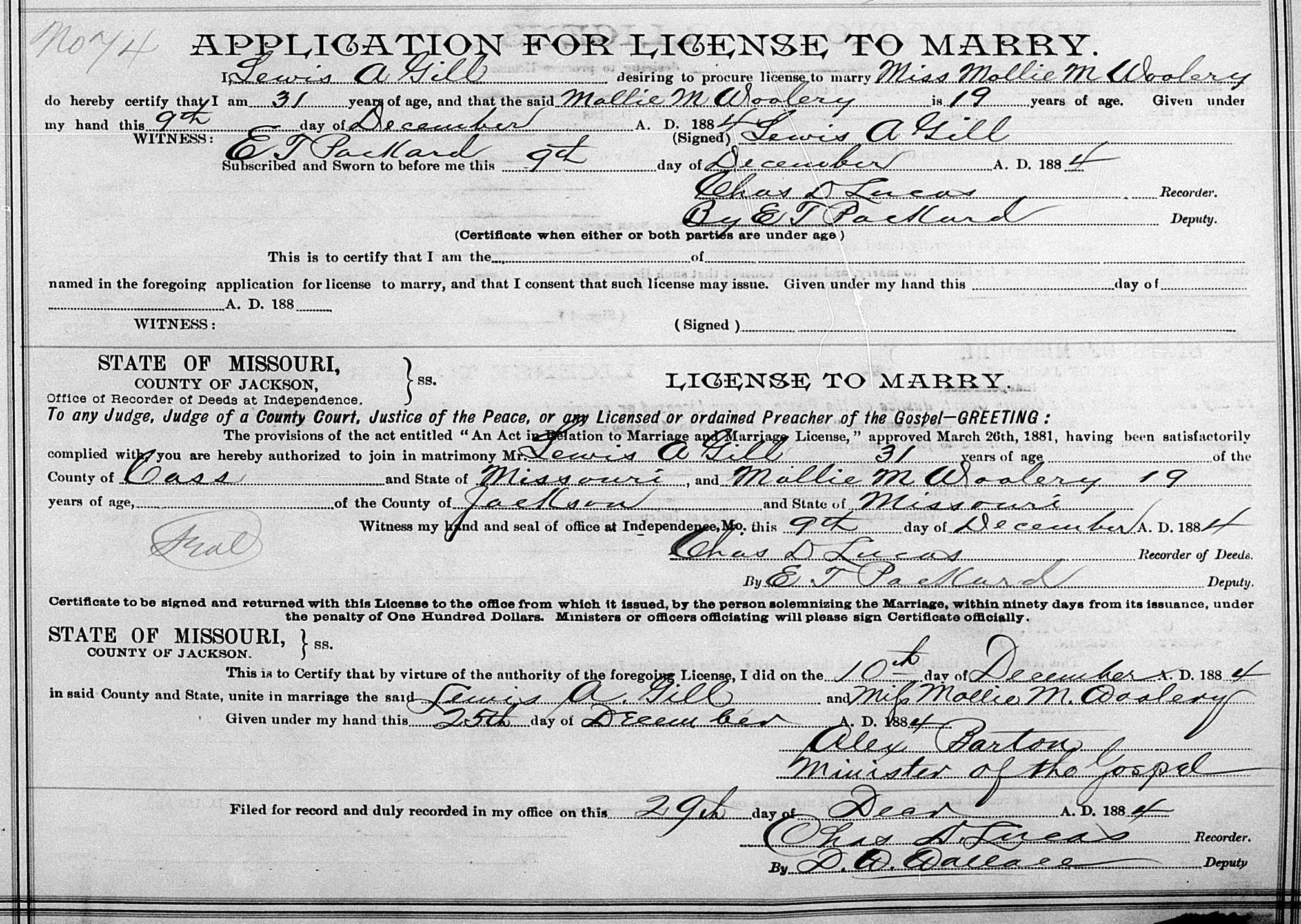 10 Dec 1884 in Jackson, Cape Girardeau County, Missouri,
