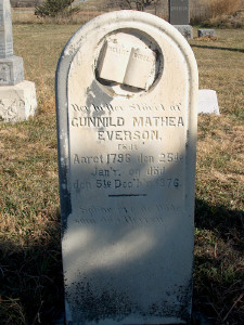 | Everson | Gunnild Mathea | Födt Aaret 1796 den 25de Janär og | död den 5te Dec'b'r 1876 | Salige ere de Vöde som dö I Herren. | ?? Written in Swedish View |