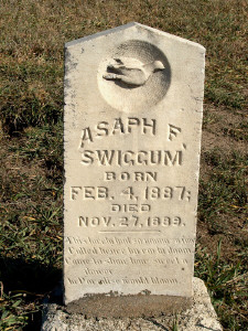 | Swiggum | Asaph F. | 4 Feb 1887 | 27 Nov 1889 | This lovely bud so ? So ?. Called hence by early doom, Came to show how sweet a flower in paradise would bloom. | View | |