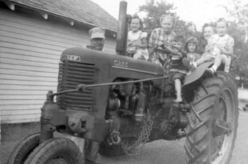 Left to right are: Fred Wood Jenkins, Judith Lee Jenkins, Reva (Burchinal) Jenkins, Gerald Roy Jenkins, Sheri Loy Jenkins, Mabel Ione (Sims) Jenkins, Janice Dee Jenkins and of course, the tractor.This picture was taken about 1947 in Conway Springs, Sumner Co, KS.