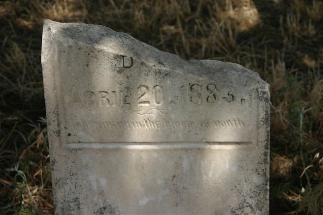 This old cemetery is north of Sun City, SWSW 36-30-15, Fred Hoagland, land owner as of 2004. Oldest marked grave still visible is Harris Adams (April 13, 1862 - April 20, 1873), son of Rev. and Mrs. Adams, Sun City's first preacher. Three graves are marked April 20, 1883, the deaths resulting from a cyclone. Identities are Mrs. S.M. Shumate (February 16, 1832); her son David (January 3, 1864); B.B. Allen (April 16, 1842).