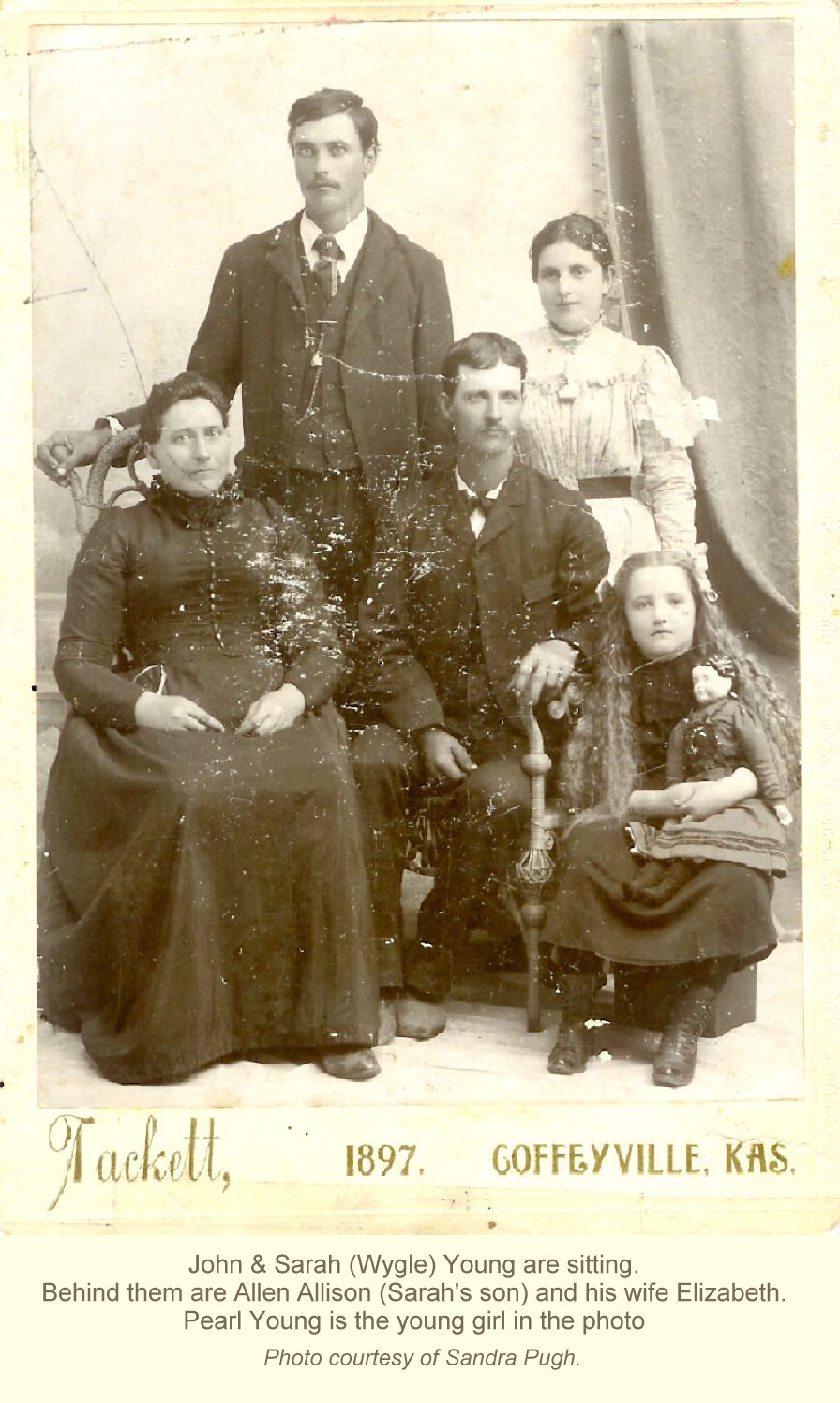At left: John & Sarah Young are sitting. Standing behind them are Allen Allison (Sarah's son) and his wife Elizabeth. Pearl Young is the young girl in the photo - age 5. Photo courtesy of Sandra Pugh."John and Sarah Ellen (Wygle) Young were my great grandparents. Their daughter Pearl Sylma (Young) Hart was my mother's mother. My mother was Lena E. Hart, the baby of the family.