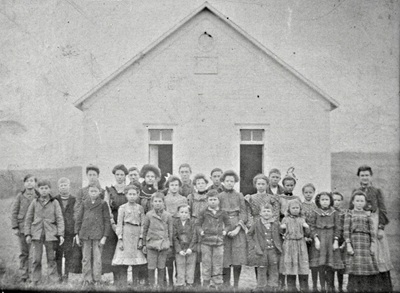Back Row: standing from Left - Oliver Hamlin, Jake Huber, Lola Brownfield, Engra Bond, Frank Hotellling, Orpha Hamlin, Fred Schilling, Earl Terrell, Frank Hammond, Teacher - Virgia Major.