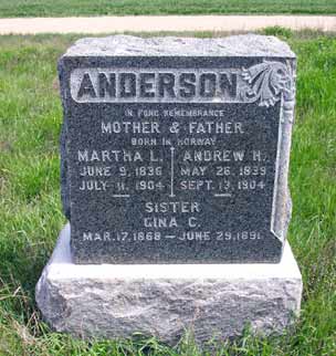 | Anderson | Martha L. | June 9, 1836 | July 11, 1904 | Mother. Born in Norway. In Fond Remembrance |