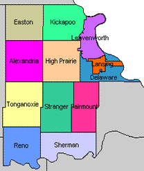 Townships (10): Alexandria, Delaware, Easton, Fairmount, High Prairie, Kickapoo, Reno, Sherman, Stranger, and Tonganoxie.